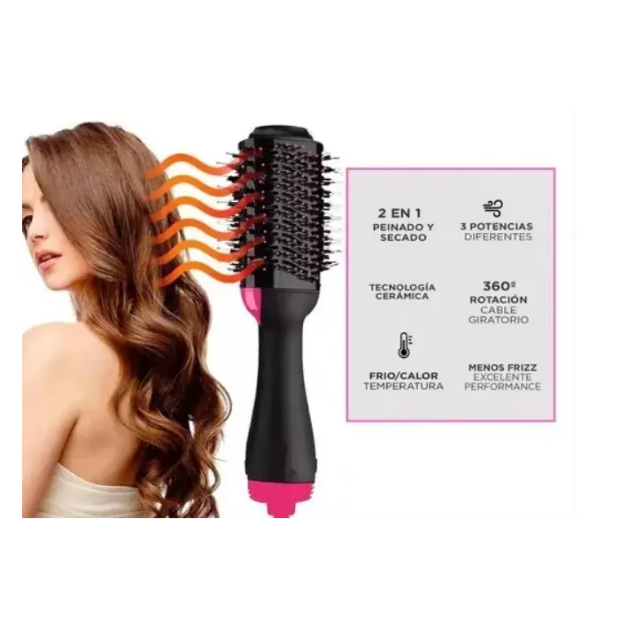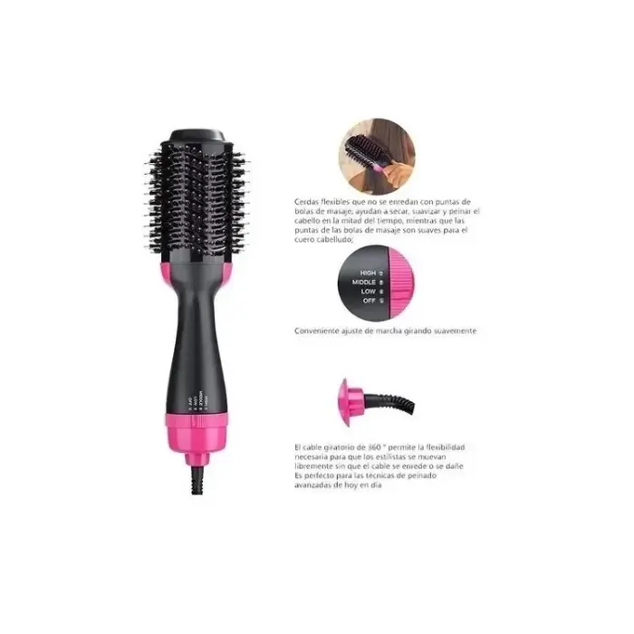 Descripción * Selector de Potencia de 3 intensidades. * Ideal para todo tipo de cabellos. * Reduce el cabello rizado, enredado, nudos, frizz, y estática. * No más dolor por desenredar tu cabello. * Potencia: 1000w. * Peinate o Hace tu Brushing al tiempo que secas tu Cabello. * Tecnología de Iones: ayuda a suavidar y dar brillo al cabello. * Uso en Hogar o Profesional. 2* Cerdas Flexibles con Extremos Redondeados para Masajear el Cuero Cabelludo. * A pesar del tamaño es Liviano y Fácil de usar. * Largo del Cable: 150cm.